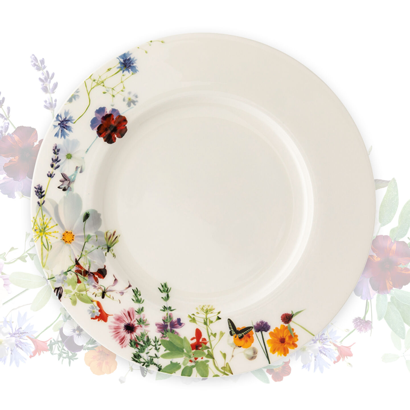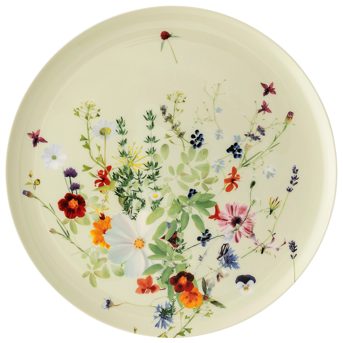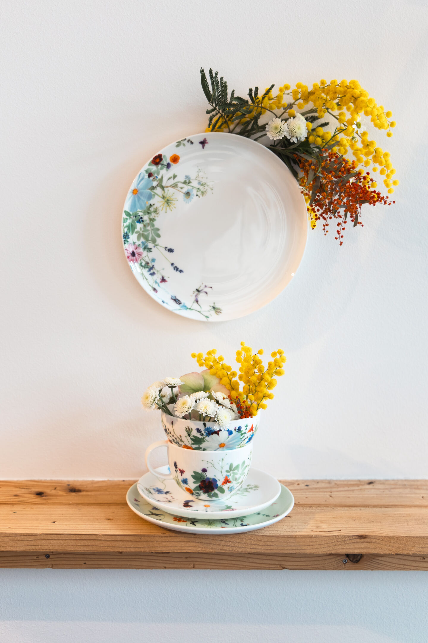 Wie vom Winde verweht und von der Natur zu einem vielfarbigen Blumenensemble kombiniert, verbinden sich würzige Kräuter und essbare Blüten in kleinen Bündeln arrangiert, lose hingestreut oder kreisförmig zu Ornamenten angeordnet, auf der Form Brillance und verschmelzen mit ihr zu einer sinnlichen Einheit.