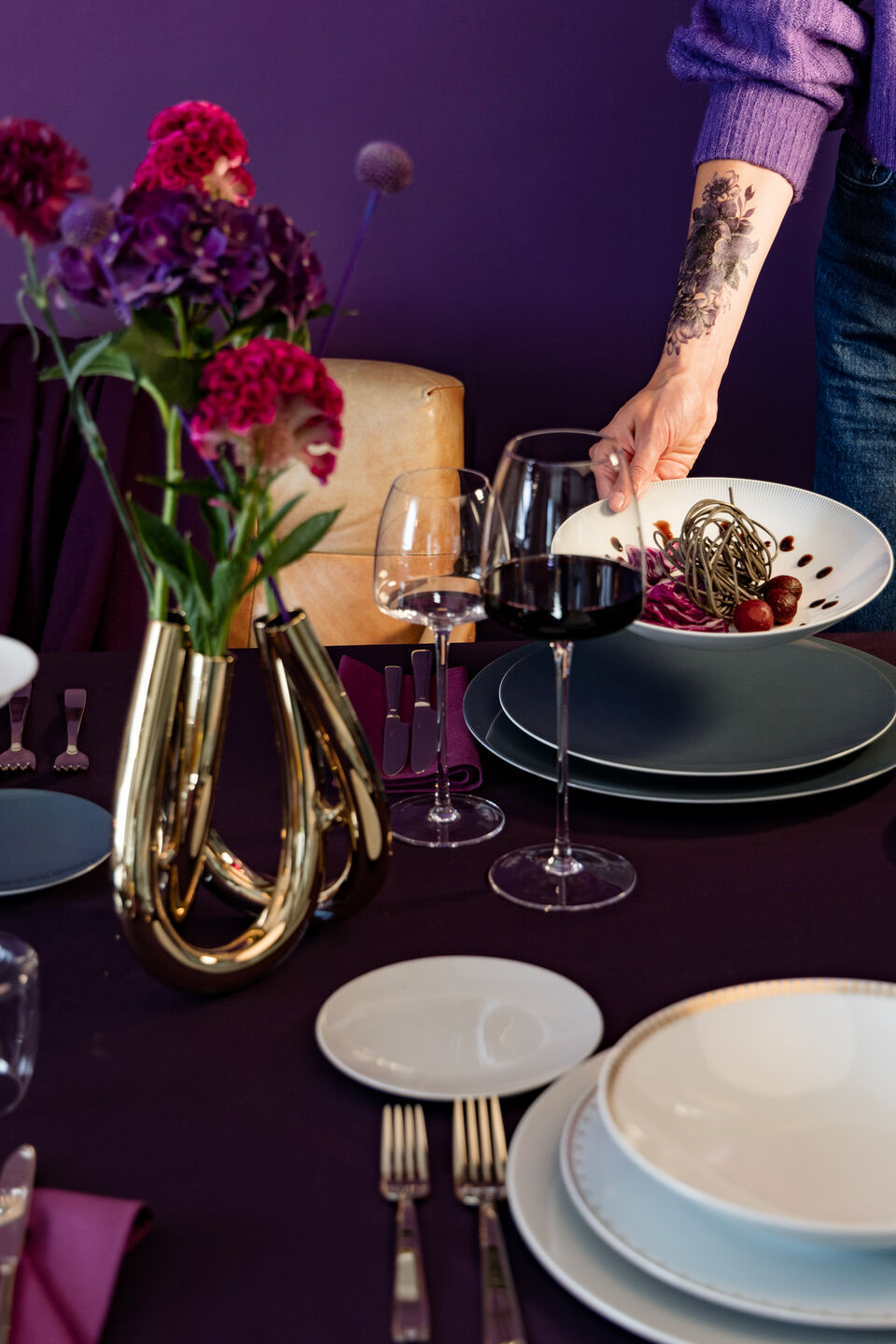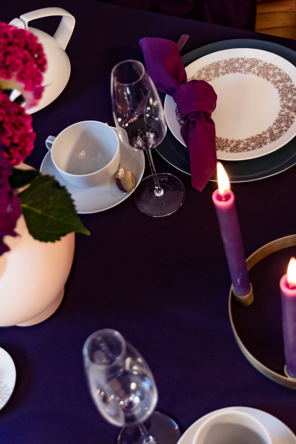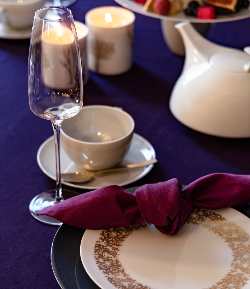 Edles Gold und tiefe Beerentöne verleihen dem gedeckten Tisch einen Hauch von Extravaganz.