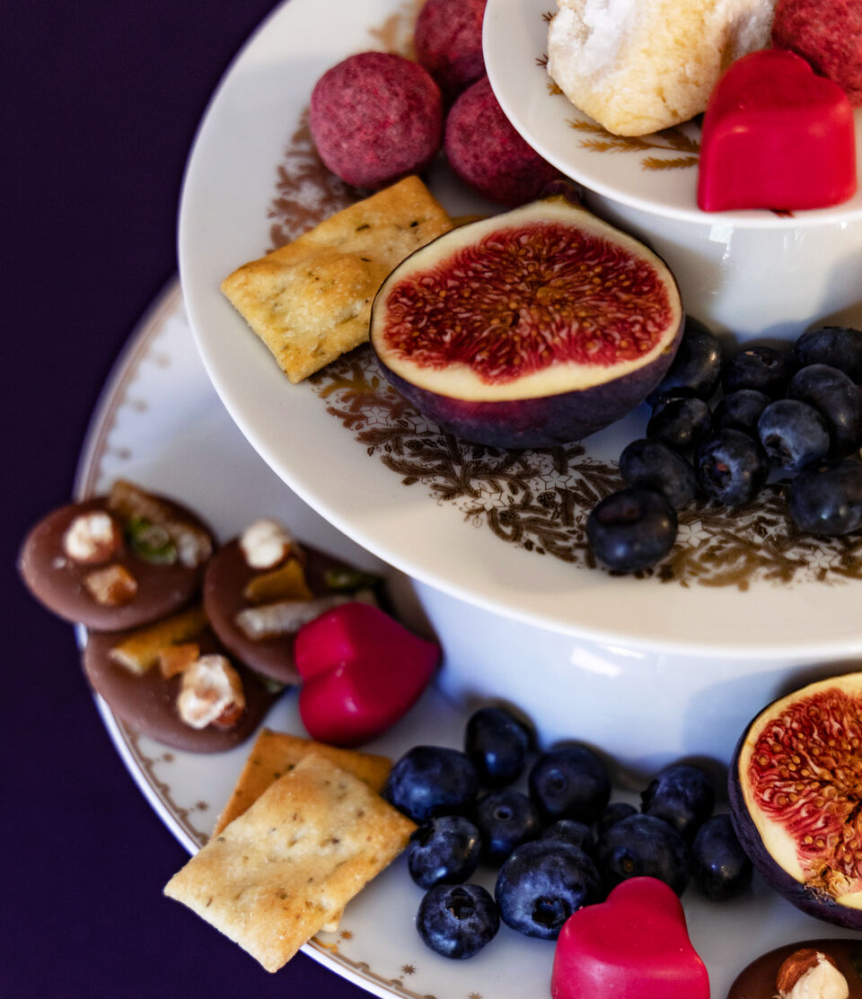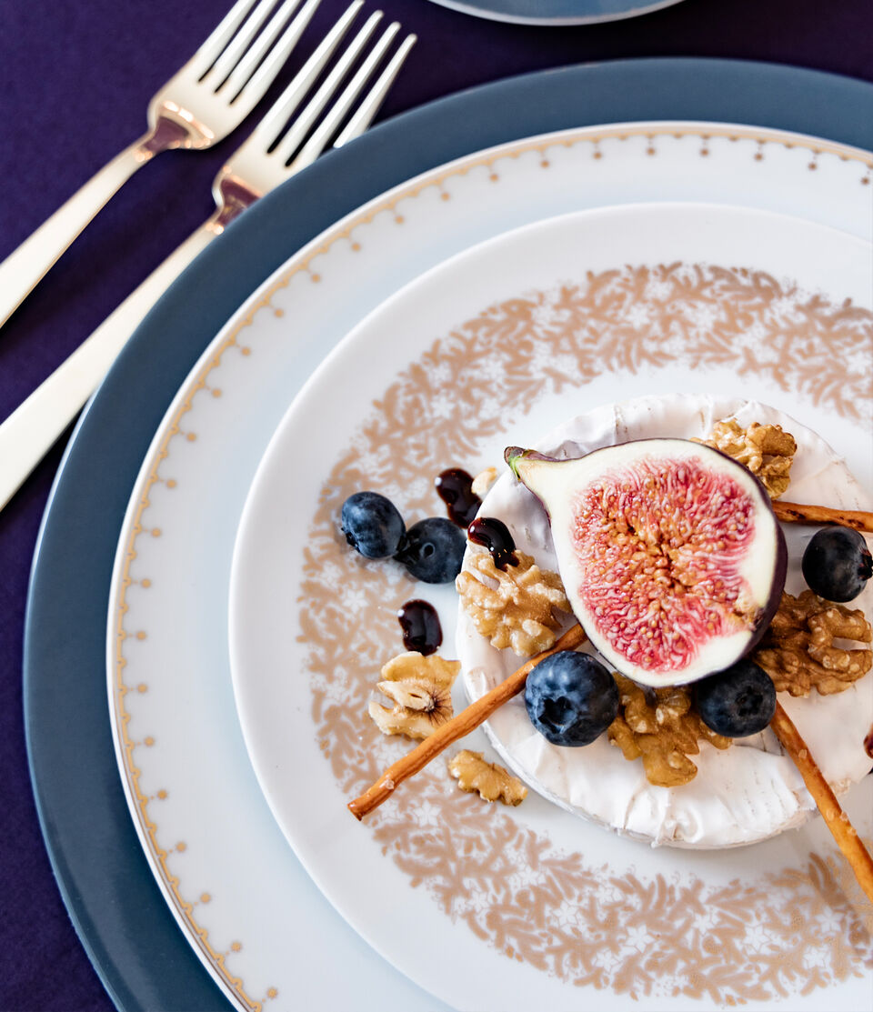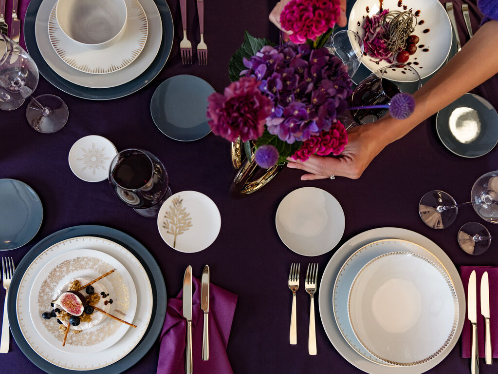 Edles Gold und tiefe Beerentöne verleihen dem gedeckten Tisch einen Hauch von Extravaganz.