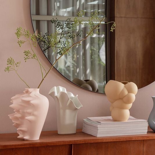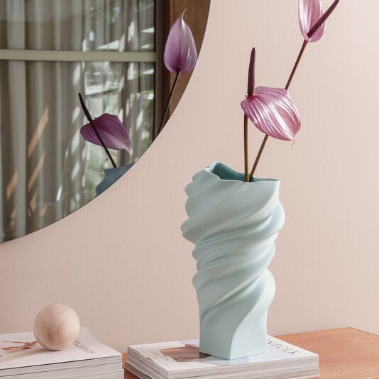 1976 designte der auf Weingläser spezialisierte Glasdesigner Claus Josef Riedel die asymmetrische Form Asym, die selbst wie eine weit geöffnete und unregelmäßige Blütenform wirkt. Jetzt ist die Vase in der weiß-opaken Farbe Sea Salt erhältlich. Mit Vase of Phases ließ sich das in New York ansässige Studio Dror von der Zerbrechlichkeit schöner Dinge inspirieren. Die Vase wirkt wie ein Schnappschuss kurz vor ihrer Explosion und debütiert nun in der Farbe Pacific. Mit der Vase Fast schuf Cédric Ragot 2006 eine Interpretation der gesellschaftlichen Veränderungen im digitalen Zeitalter. Fasziniert von der Plastizität und den Grenzen der Verformbarkeit von Materialien hat Ragot zudem Squall entworfen: die im Jahr 2007 designte Vase fängt eine dynamische Bewegung ein und lässt sie erstarren. Die Vase Skum (dän.: Schaum) des Architekturbüros BIG ist einem aufblasbaren Kunstpavillon nachempfunden, den der dänische Star-Architekt Bjarke Ingels 2016 entworfen hat. Der bekannte Designer Sebastian Herkner hat mit Hop eine Vase kreiert, deren übereinandergeschichtete Ringe an Michelin-Männchen oder an Skulpturen des Künstlers Tony Cragg erinnern.