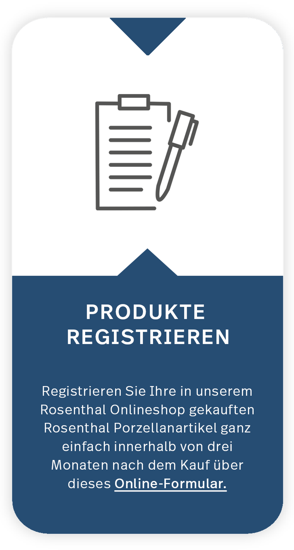 Alle Porzellanartikel (inkl. der Serien aus Bone China, Steingut oder Keramik) der Marke Rosenthal können Sie zur Teilnahme an unserer Bruchgarantie anmelden. Glaswaren (Trinkgläser, Glasvasen), stücklimitierte Artikel sowie alle Artikel der Marken „Rosenthal meets Versace“ und „Swarovski x Rosenthal“ sind von der Garantie jedoch ausgeschlossen.