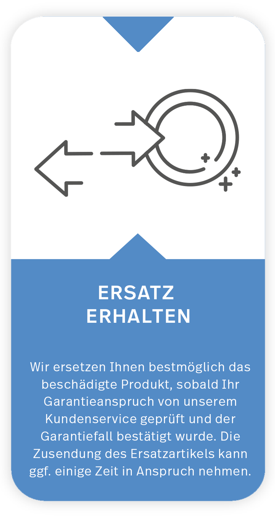 Wir bemühen uns, den zu Bruch gegangenen Artikel möglichst 1:1 zu ersetzen. Sollte der Artikel, für den Sie die Bruchgarantie registriert haben nicht mehr lieferbar sein, werden wir Ihnen ein Alternativprodukt unserer Wahl als Ersatz gewähren.