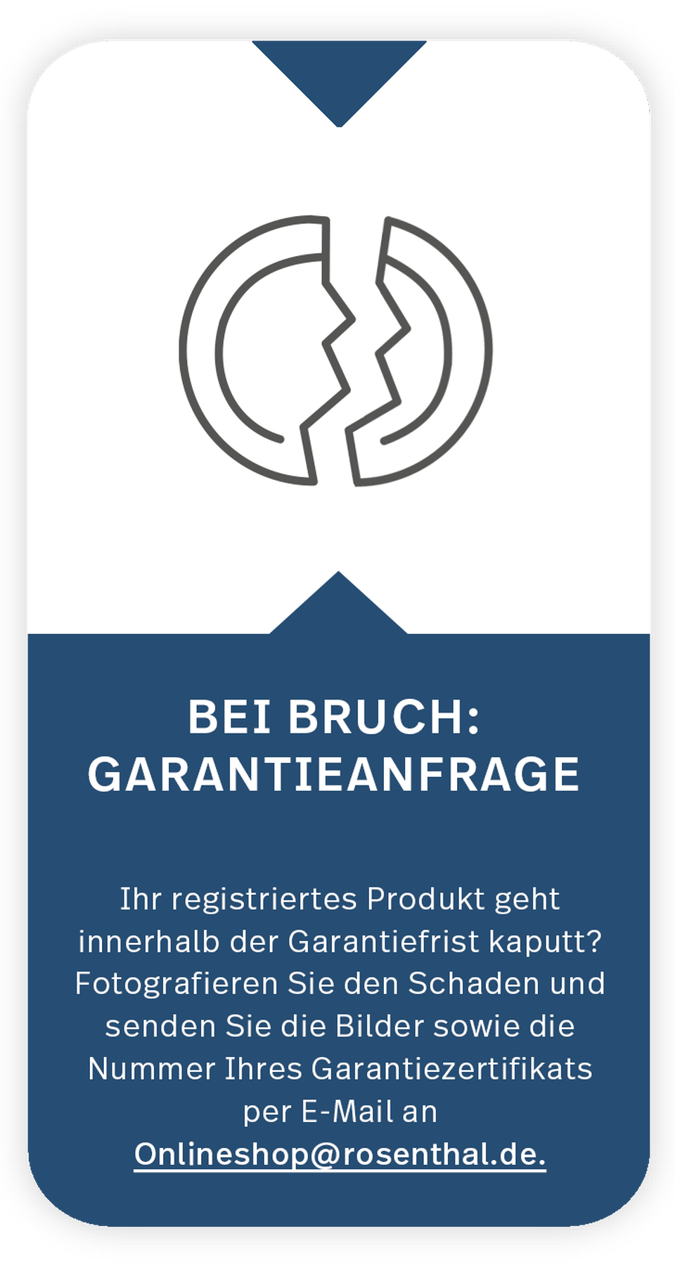 Ein für die Bruchgarantie registriertes Produkt ist innerhalb der dreijährigen Garantiefrist kaputt gegangen oder wurde stark beschädigt? Machen Sie Fotos von dem betroffenen Artikel, auf denen neben dem Schaden möglichst auch der Artikel und der Rosenthal Bodenstempel erkennbar sind. Die Fotos senden Sie dann unter Nennung Ihrer Bruchgarantie-Registrierungs-Nr. (diese steht auf Iherm Bruchgarantie-Zertifikat) und einer kurzen Beschreibung des Schadens per E-Mail an Onlineshop@rosenthal.de . Unser Kundenservice wird sich umgehend um Ihre Anfrage kümmern.