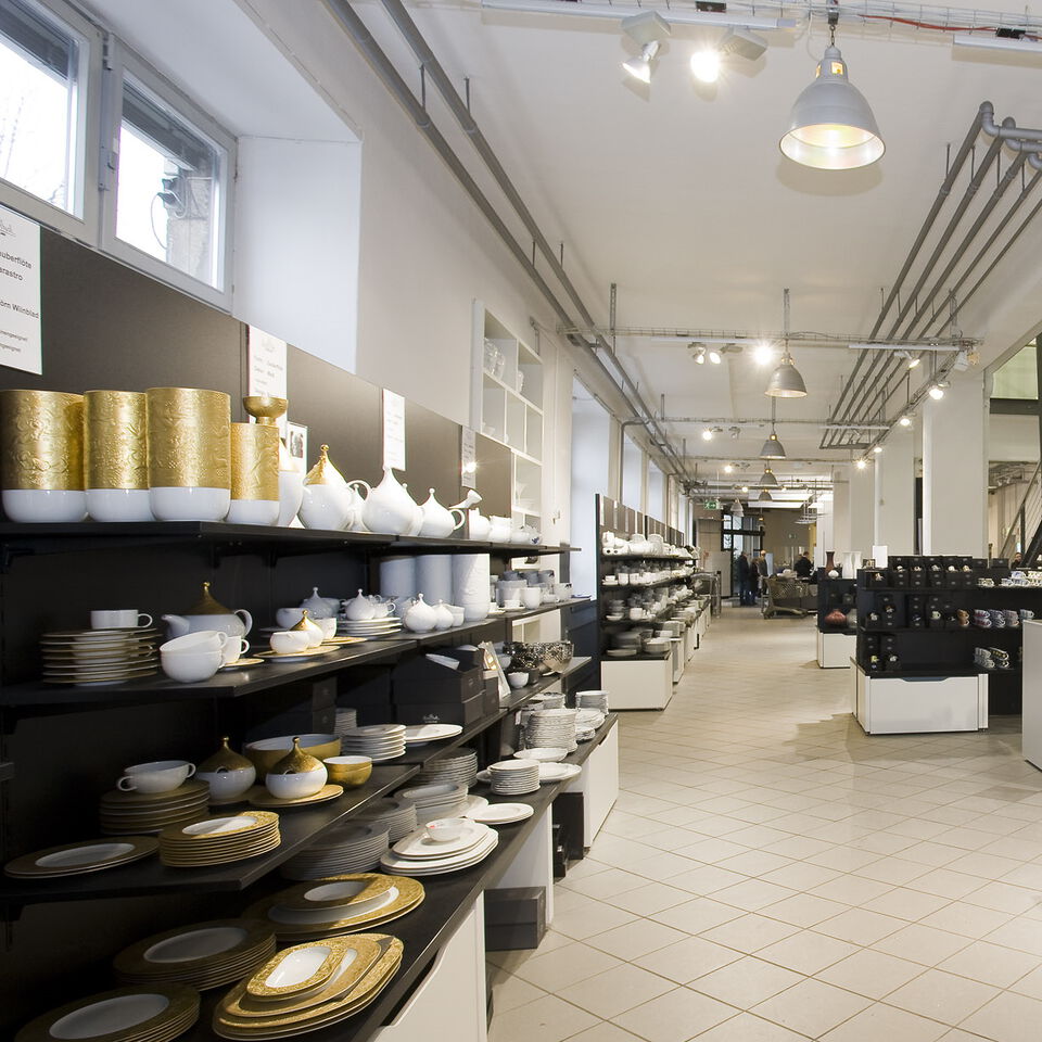The Rosenthal Outlet Center in Selb opens up its doors and offers those who love porcelain more than 4,000 m² of unique shopping experience in the kiln hall of the former Rosenthal factory. The ambience with the tunnel kilns and original work stations which are still in place is marked by colour, light and style. The Rosenthal Outlet Center is transformed into something quite special with its broad pathways, clear presentation and places to take a rest.