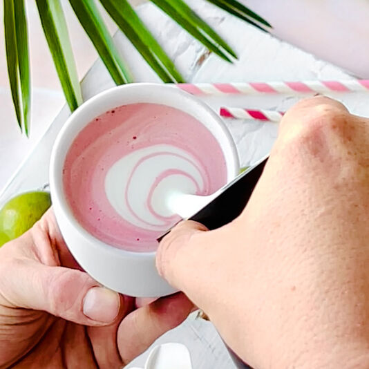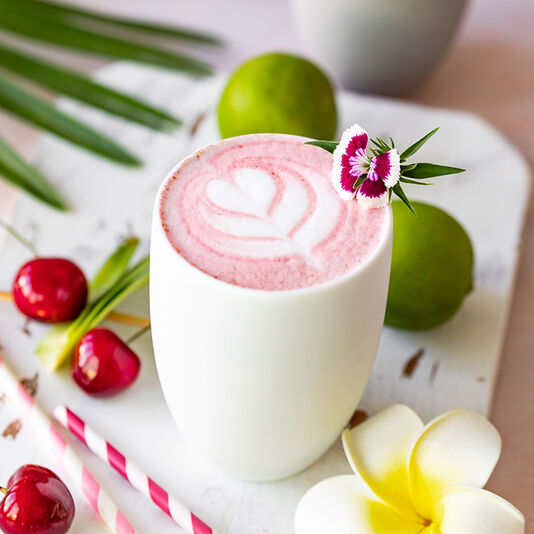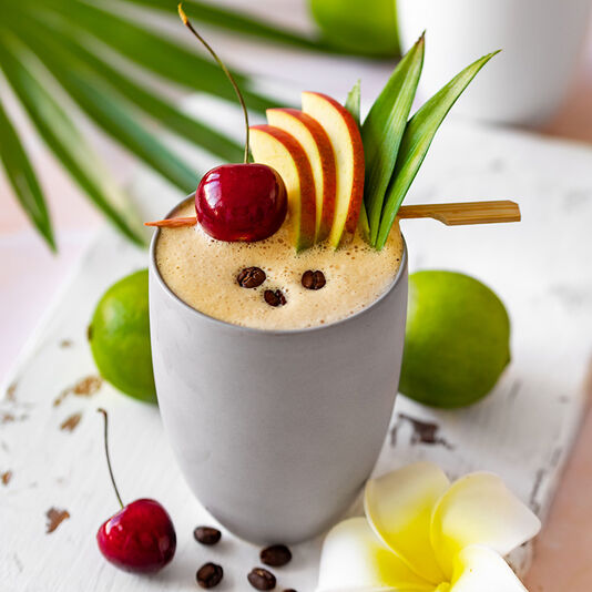 Place all the ingredients in a blender or shaker and mix well. Choose your favourite colour of The Mug+ and serve the mix in it. Garnish with coffee beans and fruit of your choice.