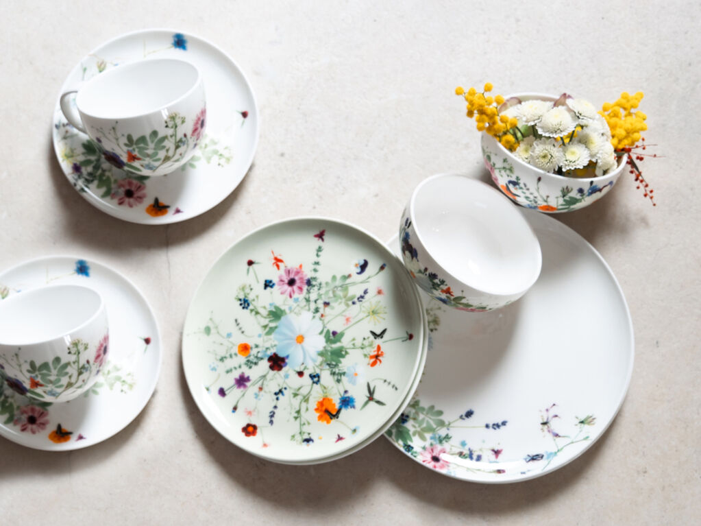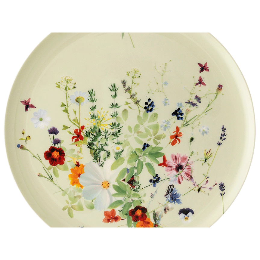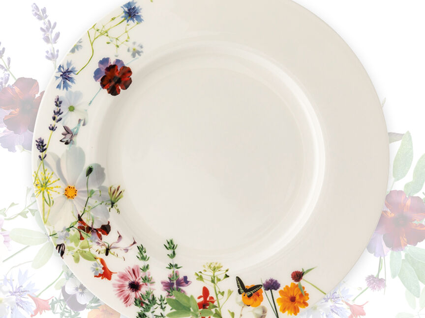 Comme emportées par le vent et réunies par la nature pour composer un ensemble floral multicolore, des herbes aromatiques et des fleurs comestibles flottent librement sur la forme »Brillance« et se fondent avec elle en une unité sensuelle.
