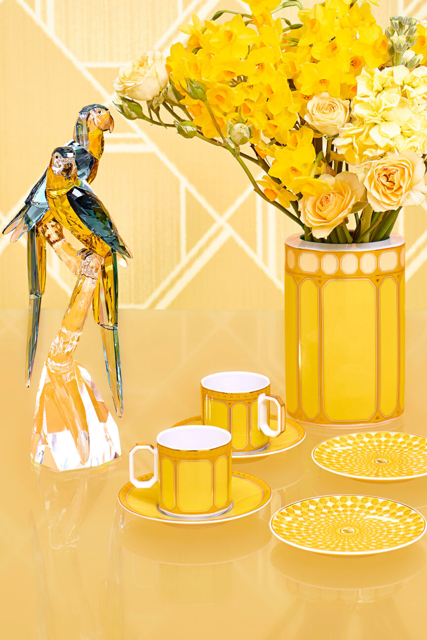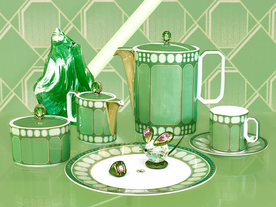 Le cristal rencontre la porcelaine - découvrez la collection unique SIGNUM. La collection SIGNUM est un hommage détaillé à l'héritage de la marque Swarovski. Outre l'octogone, les couleurs de la marque Swarovski - bleu, vert, jaune et rose - ont été capturées dans un design graphique et ornées de touches dorées peintes à la main - un autre détail qui fait référence au riche héritage et au savoir-faire de Swarovski dans la conception et la fabrication de bijoux.