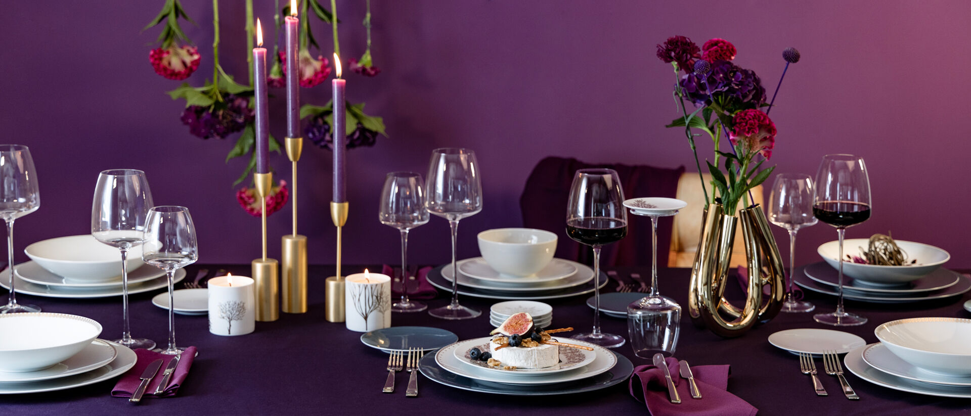 La noblesse de l’or et la profondeur des tonalités rosées-violacées donnent à la table dressée une pointe d’extravagance.